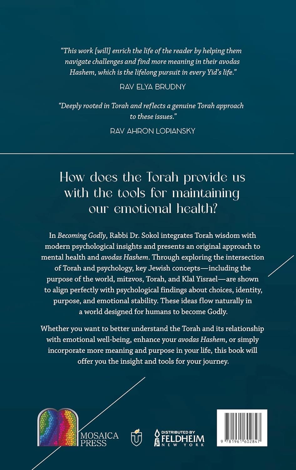 Becoming Godly by Rabbi Dr. Yosef Sokol presents an original approach to mental health and Avodas Hashem. This groundbreaking book integrates Torah wisdom with modern psychological insights, showing how Jewish concepts like mitzvos, Torah, and Klal Yisrael align with key principles of identity, emotional stability, and purposeful living. Whether you want to enhance your spiritual growth or incorporate deeper meaning into your life, this sefer offers insights and tools for your transformative journey to becoming Godly.