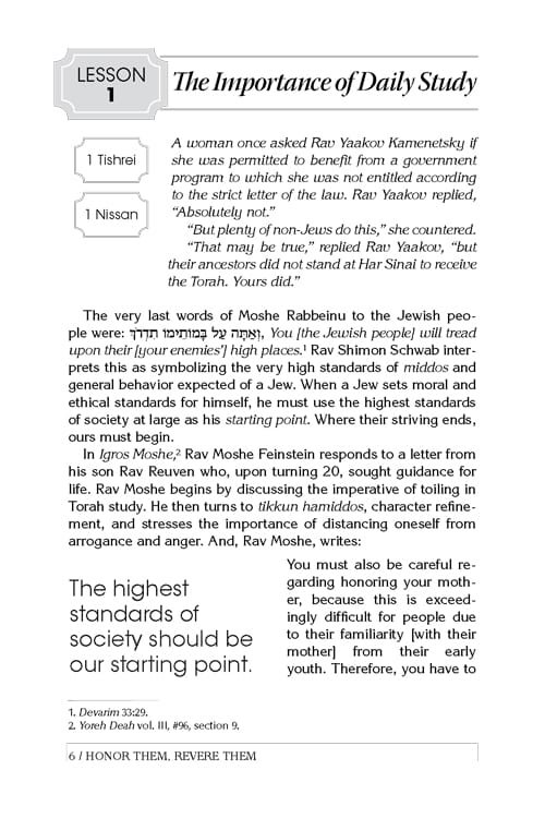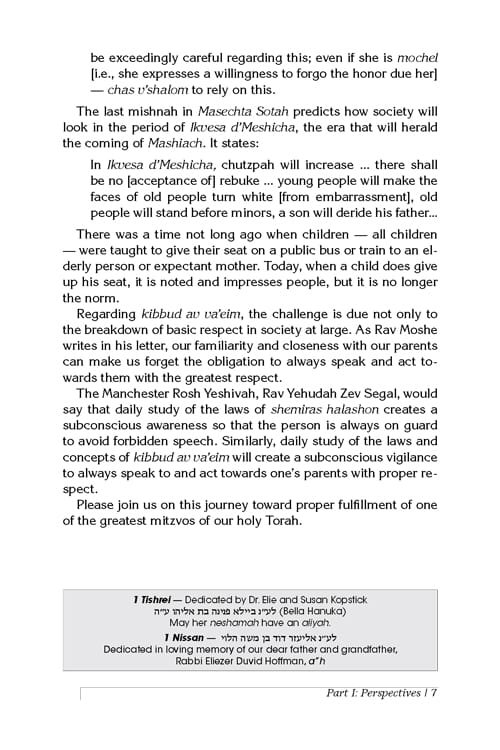 In short daily readings, we will discover how to honor and revere our parents, through true stories, Torah insights, and practical advice. By reading about kibbud av vaÂ’eim every single day, we will incorporate these ideas into our minds, hearts – and actions.