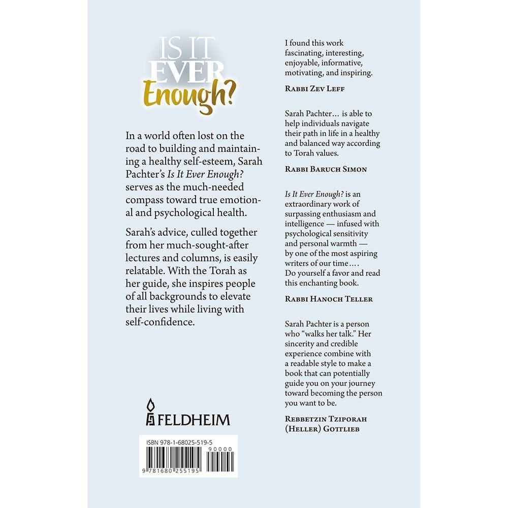 In a world often lost on the road to building and maintaining a healthy self-esteem, Sarah Pachter’s Is It Ever Enough? serves as the much-needed compass toward true emotional and psychological health.