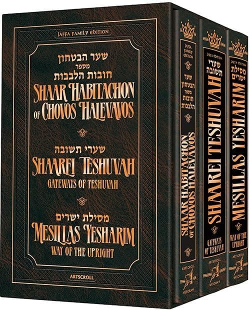 Three mussar classics in one convenient slipcase set: The Jaffa Edition Shaar HaBitachon of Chovos HaLevavos, The Jaffa Edition Shaarei Teshuvah, and The Jaffa Family Edition Mesillas Yesharim