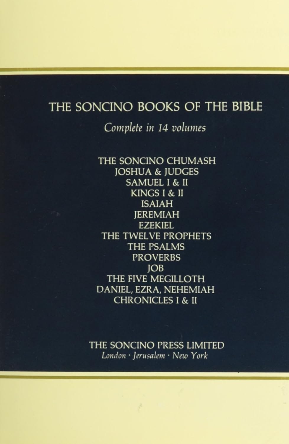Used in English-speaking countries for more than half a century, the masterful Soncino Books of the Bible series has become the classic English rendering of the Bible. This vast work, painstakingly prepared by scholars under the general editorship of Rabbi Abraham Cohen, contains the complete Hebrew text and an elegant and lucid verse-by-verse translation, as well as an illuminating commentary digest based on the works of classical scholars. Extensive introductions provide invaluable help in understanding each book’s purpose. With its compact, practical size and distinctive format, this is the most accessible and complete text for all students of the Bible. Each volume contains an index and a bibliography.