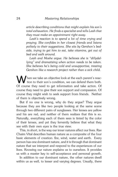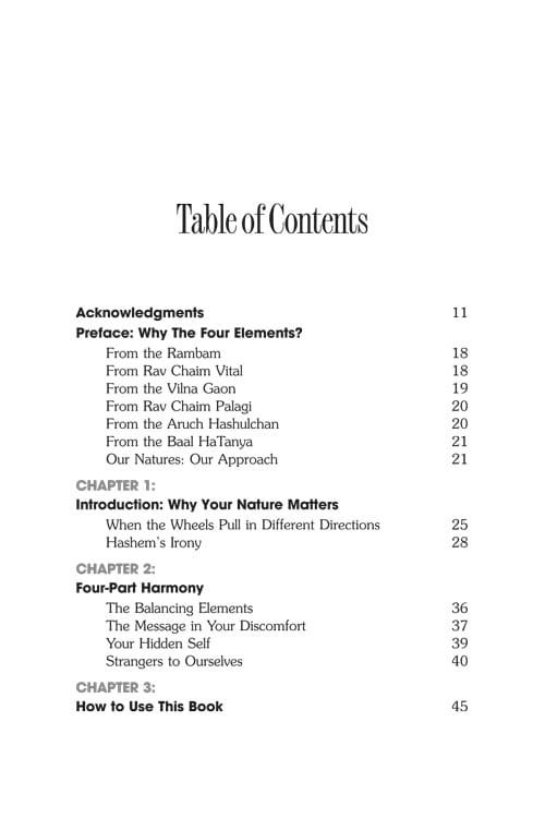 Rabbi Mordechai Weinberger LCSW is a master therapist, acclaimed public speaker, and popular radio show host who has helped thousands of people build better, more satisfying, and happier lives. Using fascinating case studies, and a considerable dose of humor, Rabbi Weinberger shows us how to identify our own “elements” as well as those of others; how to capitalize on our traits so they lead to success and not disaster; how to balance our natures and complement our strengths, making them even more effective; and how to interpret people’s behavior so we can deal properly with them. He explains how a husband with a “fiery” temperament can understand his wife, whose nature is dominated by “wind.””A businessman characterized by the traits of “earth” will be afraid of risk; perhaps he needs to strengthen his attitude of “”water” in order to succeed.
