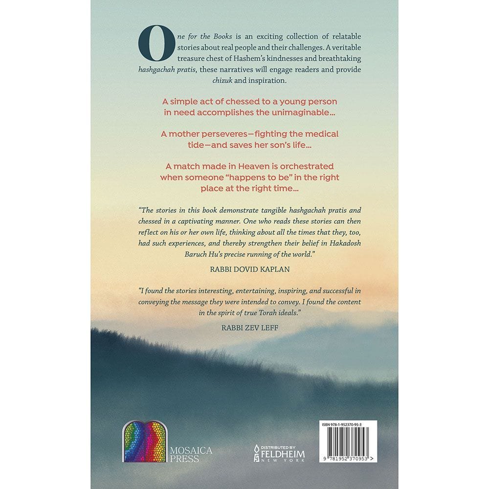 One for the Books is an exciting collection of relatable stories about real people and their challenges. A veritable treasure chest of Hashem’s kindnesses and breathtaking hashgachah pratis, these narratives will engage readers and provide chizuk and inspiration.