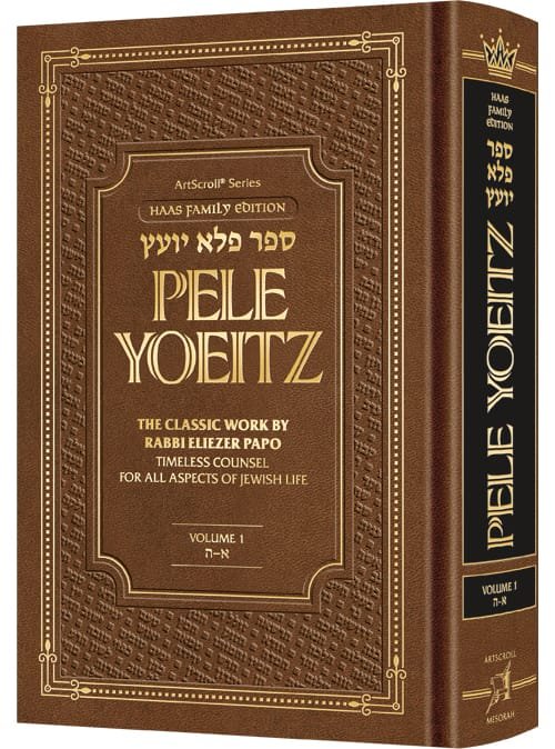 Pele Yoeitz is an encyclopedia of Jewish ethics, prayer, behavior, guidance, and thought authored by the renowned 19th-century halachic authority, ethicist, and kabbalist Rav Eliezer Papo. Pele Yoeitz was written two hundred years ago, but it speaks to our generation as if it were written today. The author covers a wide variety of topics, in alphabetical order, from aleph to tav. He doesn’t preach or rebuke. He teaches and discusses. He leads us by the hand. He blends higher aspirations, demands for growth, and an astounding command of Torah sources with a keen awareness of human nature. The serious reader cannot fail to be inspired to grow.