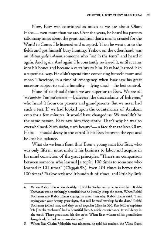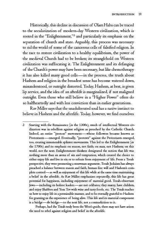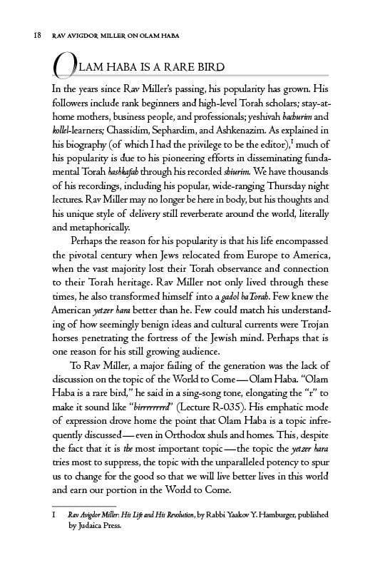 This book — a collection of Rav Miller’s teachings on the topic of Olam Haba — is an attempt to correct that, to restore Jewish belief in Olam Haba to its rightful place. Belief in Olam Haba is the pinnacle of our emunah, right alongside belief in Hashem Himself, as Rav Miller often explained.