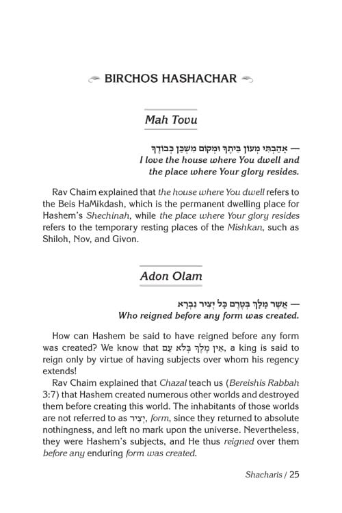 Rav Chaim on Tefillah, which was prepared for print right before his passing, includes insights on the words and themes of the daily prayers shared directly by Rav Chaim and collected from his extensive writings, as well as dozens of stories about Rav Chaim, his beloved wife Rebbetzin Kanievsky, and his illustrious family. Compiled by Rabbi Shai Graucher, who was an almost-daily visitor to R’ Chaim’s home, this is a work that will bring your davening to a whole new level.