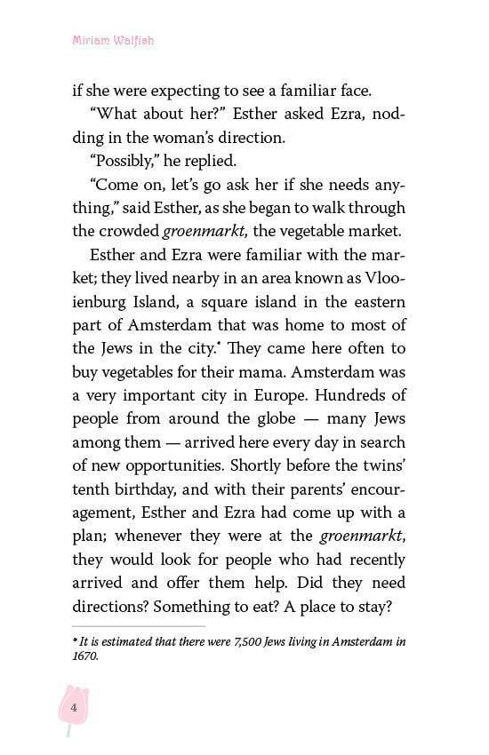 Meet Esther Bueno, a Jewish girl growing up in the 1670s with her twin brother, Ezra. Their parents fled Portugal when they themselves were children in order to escape the Inquisition. Now the Bueno family lives in Amsterdam — one of the busiest, most exciting cities in all of Europe. Read about the Bueno twins and share their adventures!