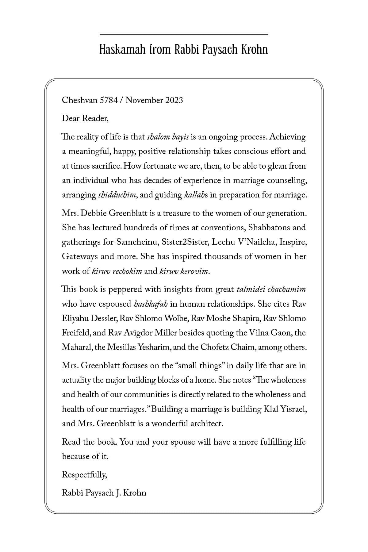In this book, world-renowned speaker Rebbetzin Debbie Greenblatt shares her decades of wisdom and experience and reveals the secrets that can make an ordinary marriage extraordinary.