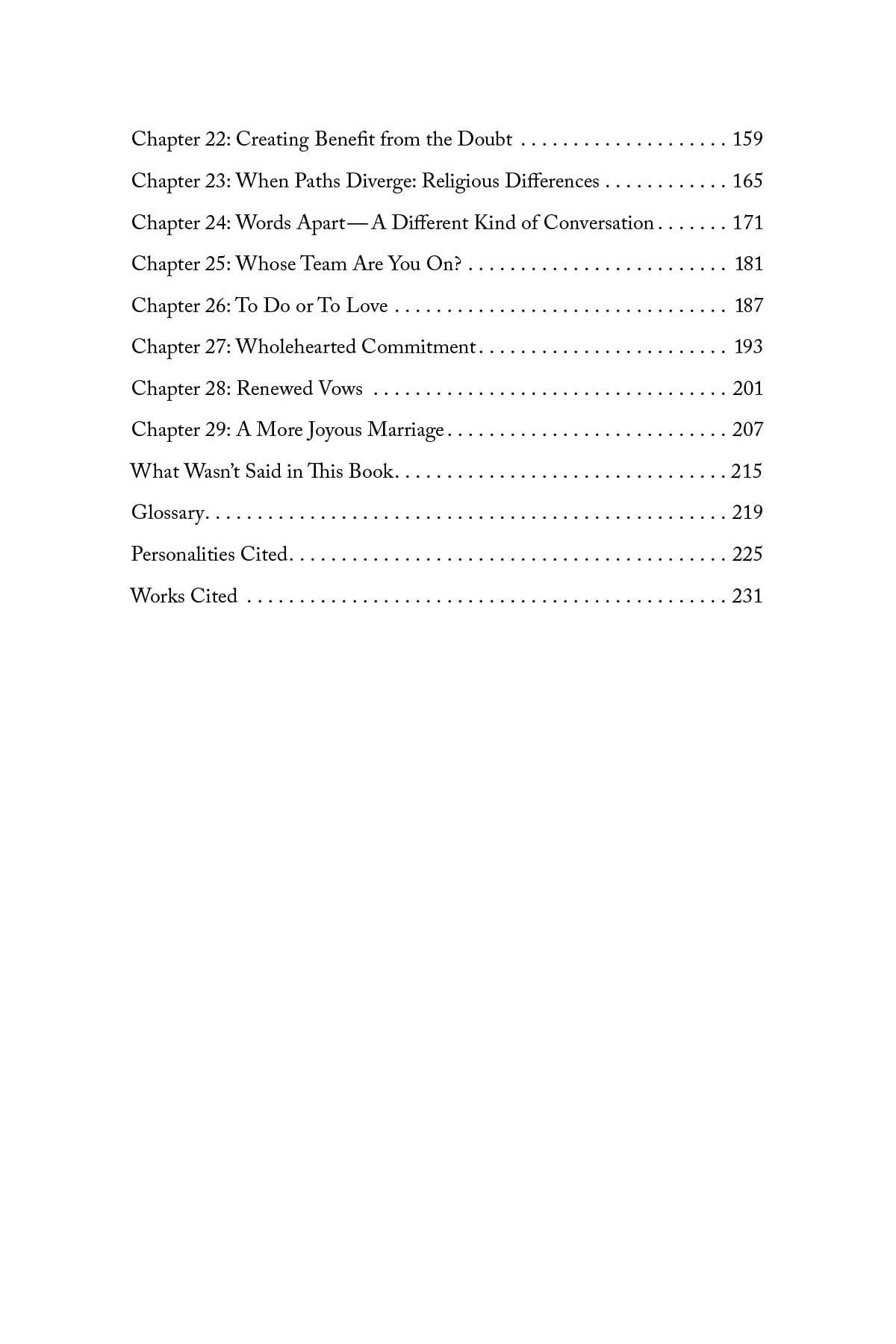 “This is an outstanding book from someone who has years of experience in helping people develop themselves and their marriages. It combines real depth with the most practical advice. The many fascinating stories lend a tangible reality to her critically important insights. This work manages to teach serious material while still being easy reading (and entertaining!). Highly recommended!”