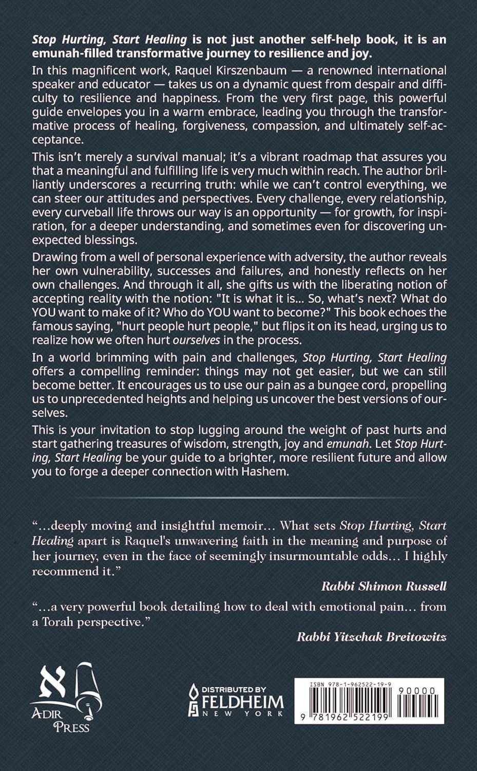 This is your invitation to stop lugging around the weight of past hurts and start gathering treasures of wisdom, strength, joy and emunah. Let Stop Hurting, Start Healing be your guide to a brighter, more resilient future and allow you to forge a deeper connection with Hashem.