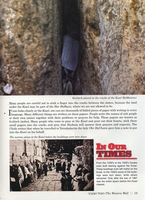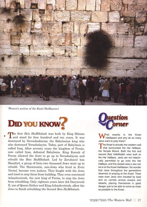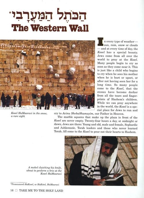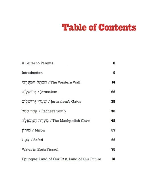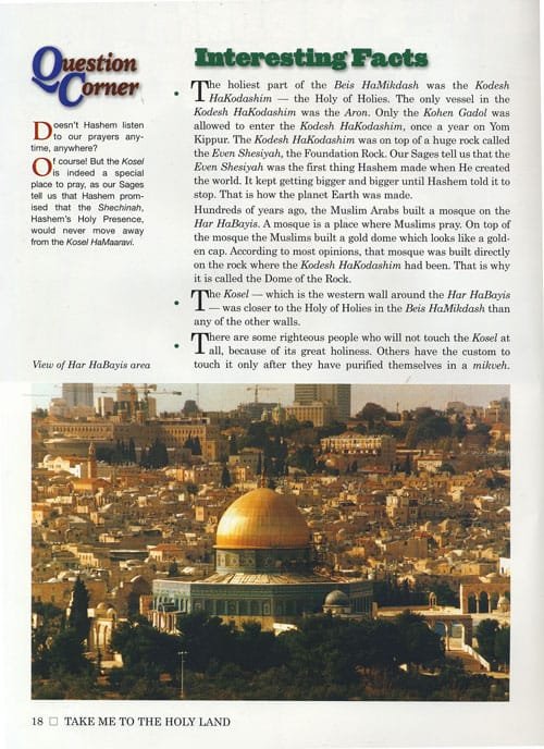 Mrs. Tsivia Yanofsky asked herself that question and decided to share her answers with the rest of us in this beautiful book. It is a very special kind of travelogue. In it, she visits numerous places, from the Kosel Hamaaravi to Maayan Elisha, and tells her children about them. Some history, some facts, some Midrashim, some interesting tidbits, some personal feelings – all made unusually appealing and interesting with the help of strikingly beautiful full-color photographs.