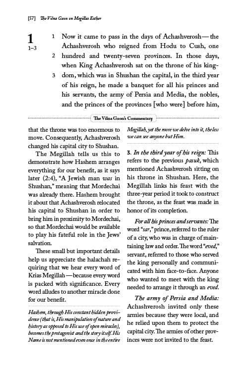 So much is hidden in the Megillah. In this first-ever English translation of the Vilna Gaon’s commentary on Megillas Esther, the Gaon reveals secrets of the Purim miracle that we so often miss. The Gaon masterfully and seamlessly weaves the Gemara’s aggadic insights into his own commentary, thereby conveying the depth and beauty that only a Torah giant like the Gaon could reveal. It will surely inspire you with a heartfelt appreciation for the greatness of the Megillah and the Purim holiday.
